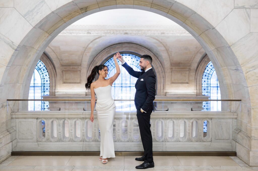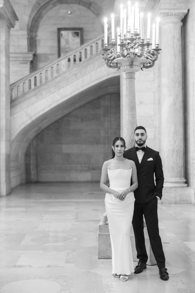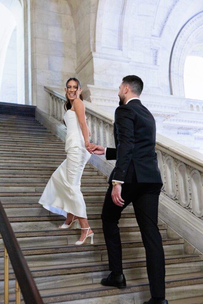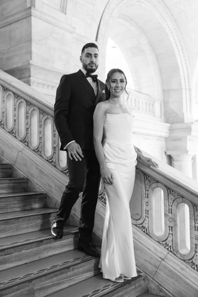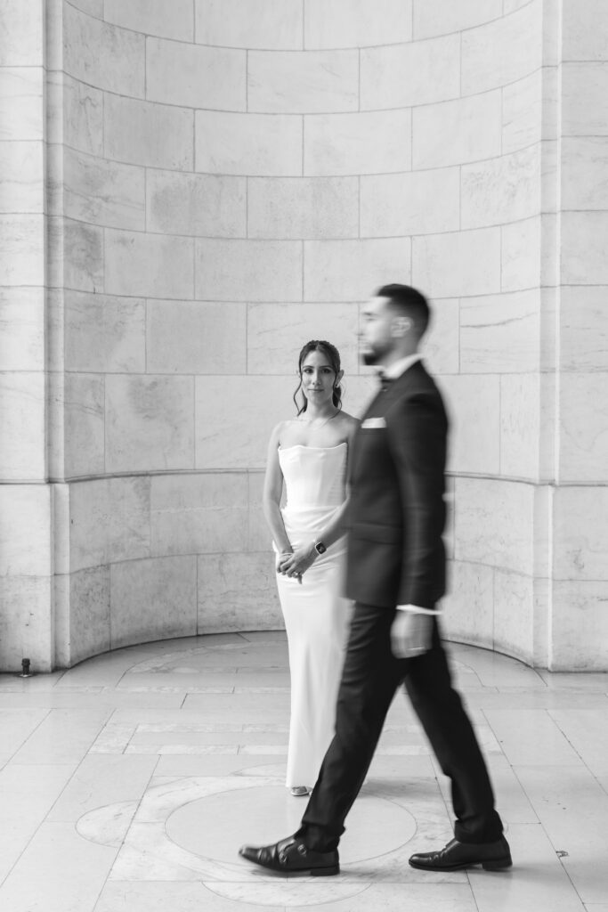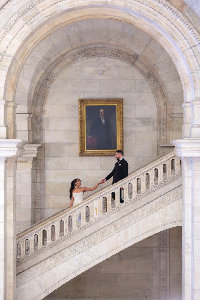 The first part of the session took place at New York Public Library, which is the perfect backdrop for editorial wedding photography in NYC. The library’s historic architecture and grand staircases allow for the perfect direct flash wedding photography look, to create timeless wedding photos. For couples looking for editorial photography in NY, New York Public Library is the perfect location.