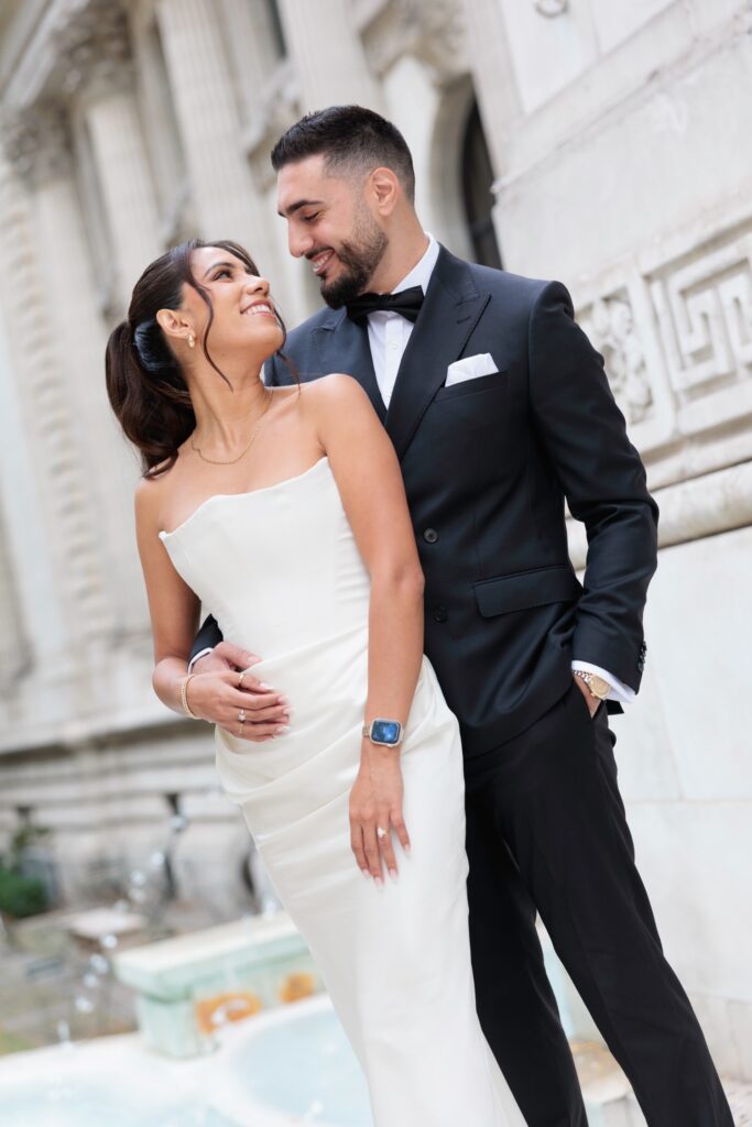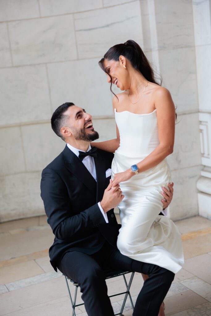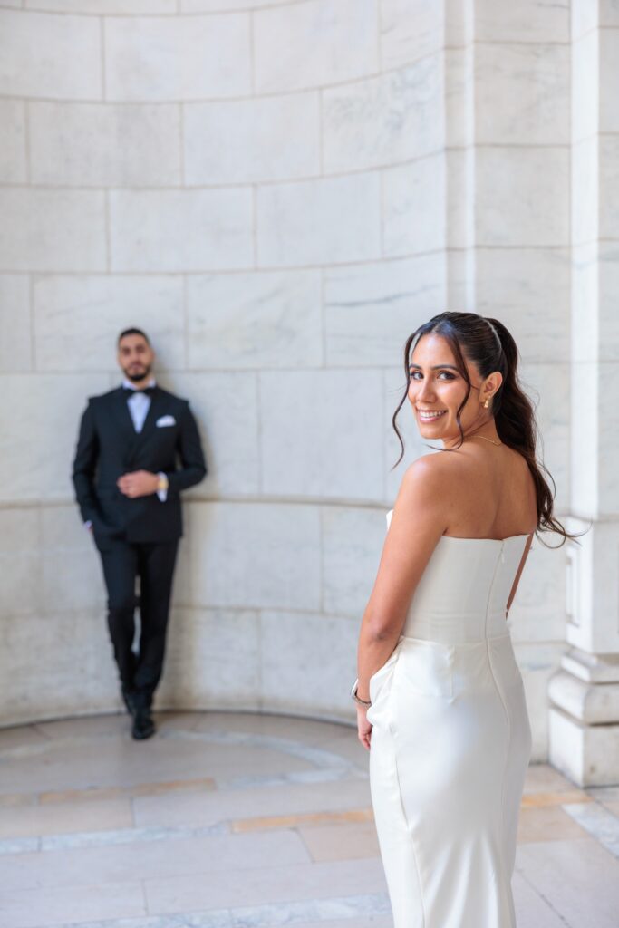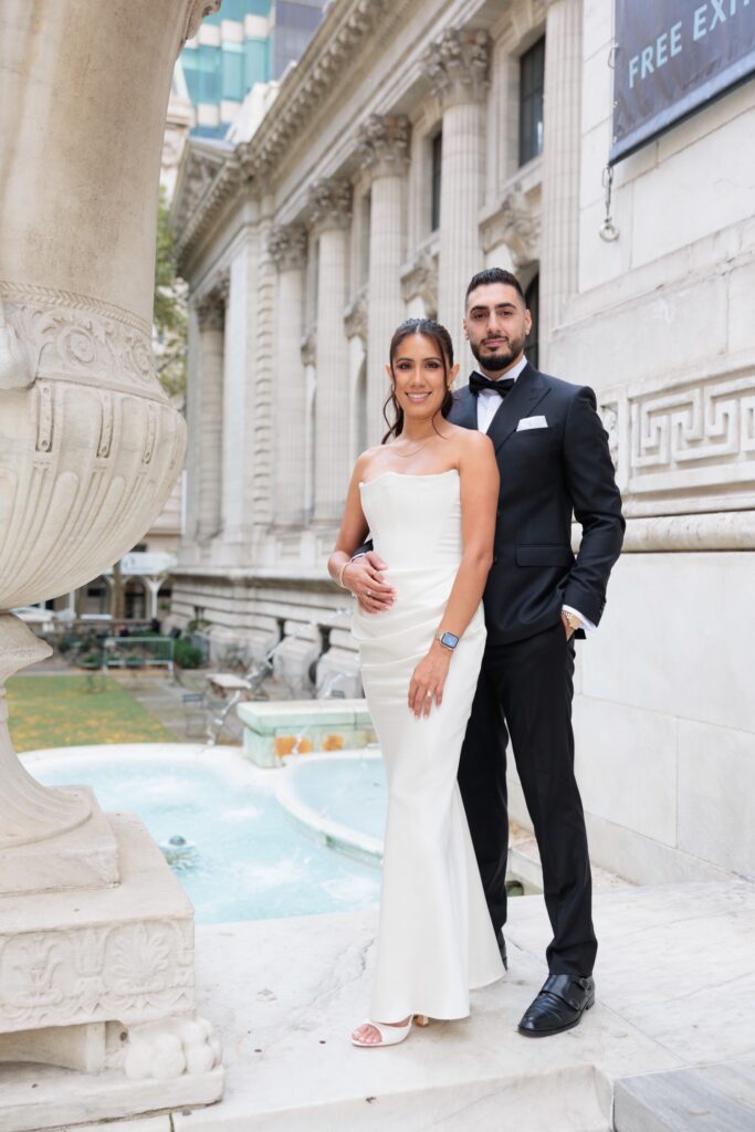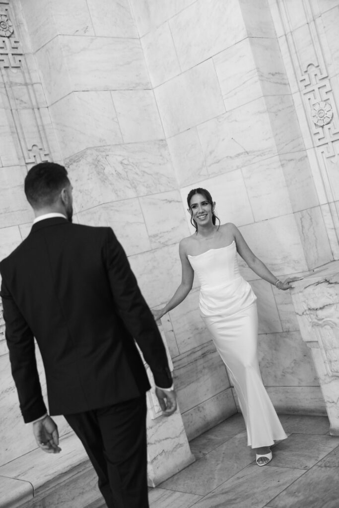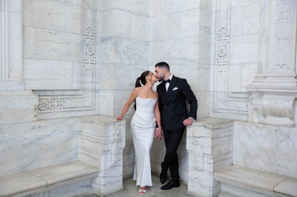 The first part of the session took place at New York Public Library, which is the perfect backdrop for editorial wedding photography in NYC. The library’s historic architecture and grand staircases allow for the perfect direct flash wedding photography look, to create timeless wedding photos. For couples looking for editorial photography in NY, New York Public Library is the perfect location.