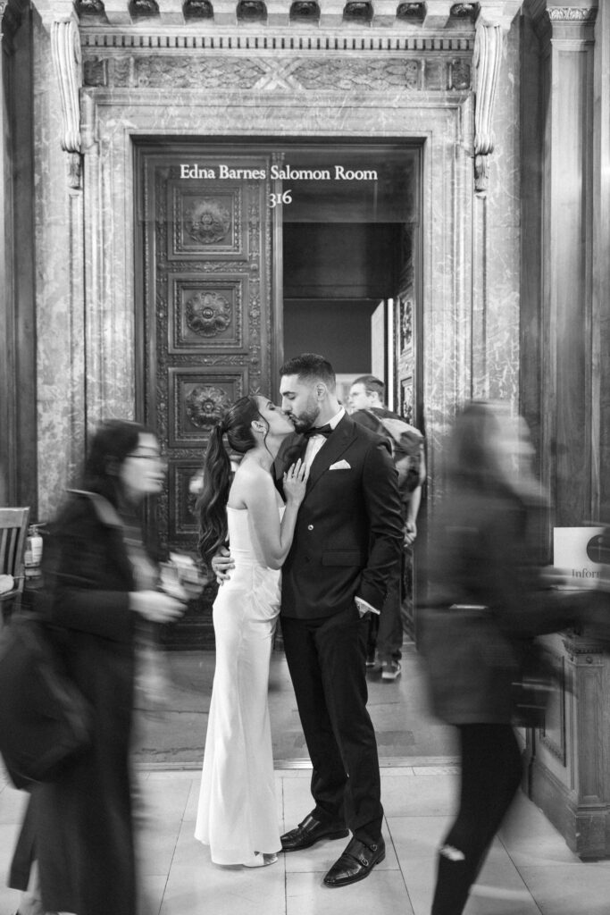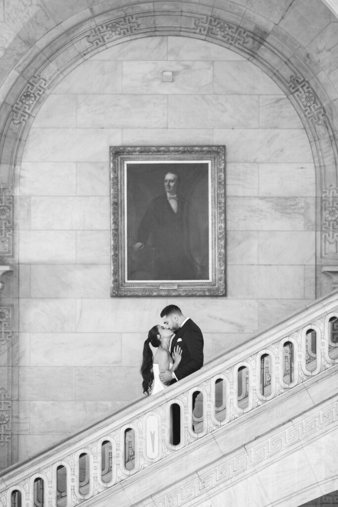 A bride and groom kissing on the staircase in front of a painting at New York Public Library for their wedding photos.