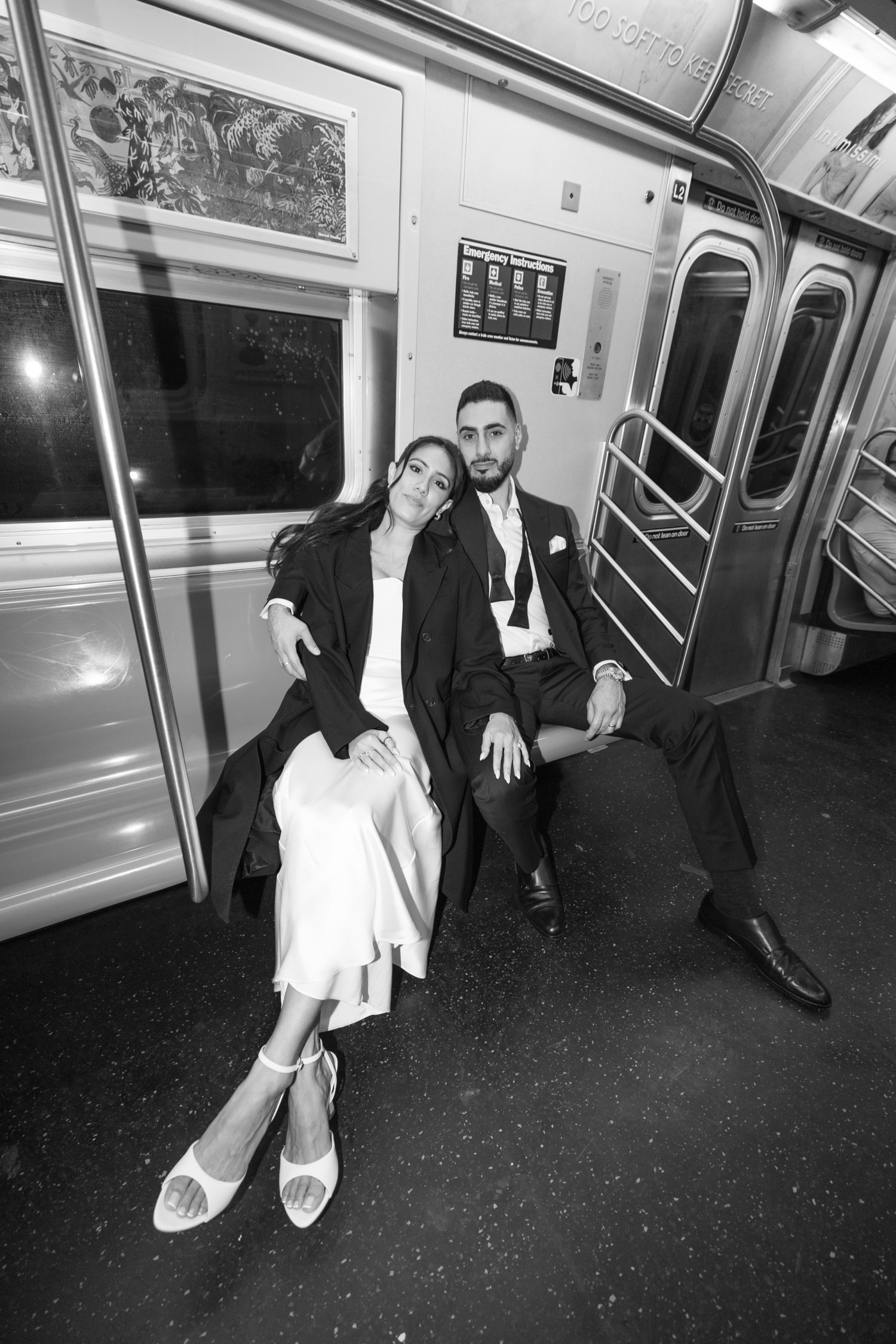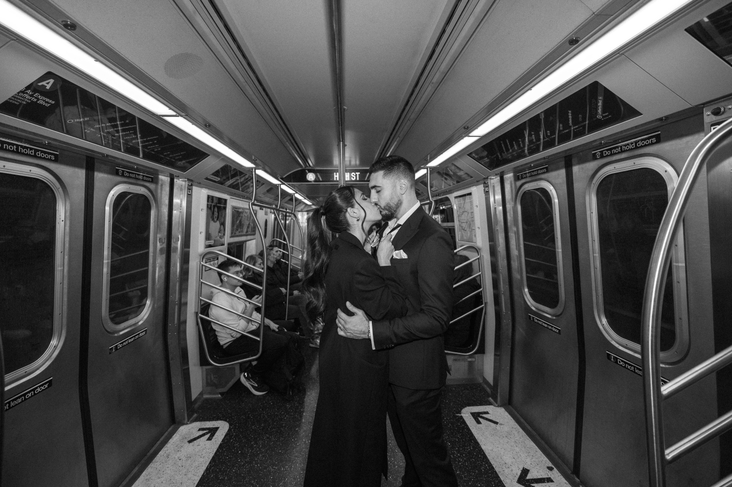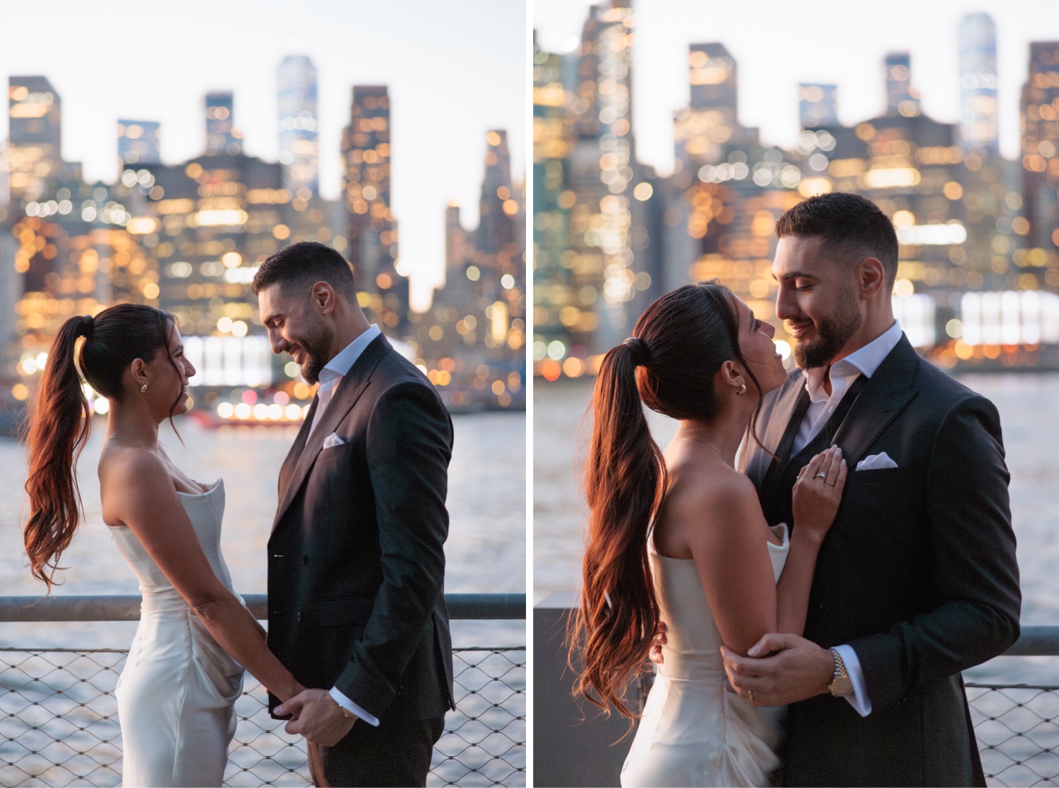 Next, we headed to Brooklyn Bridge Park, a spot that Aaliyah and John spent a lot of time together during their relationship. To add a little bit of extra fun to their wedding photos, we took the subwab, where we took a couple of wedding photos on the NYC subway. These candid moments showcased their personality in a different setting, adding a candid twist to their editorial and documentary wedding photos. This energy continued at Brooklyn Bridge Park where we captured natural and unposed moments – the essence of documentary wedding photography. The lighting of the city skyline provided a beautiful backdrop to their wedding photos.