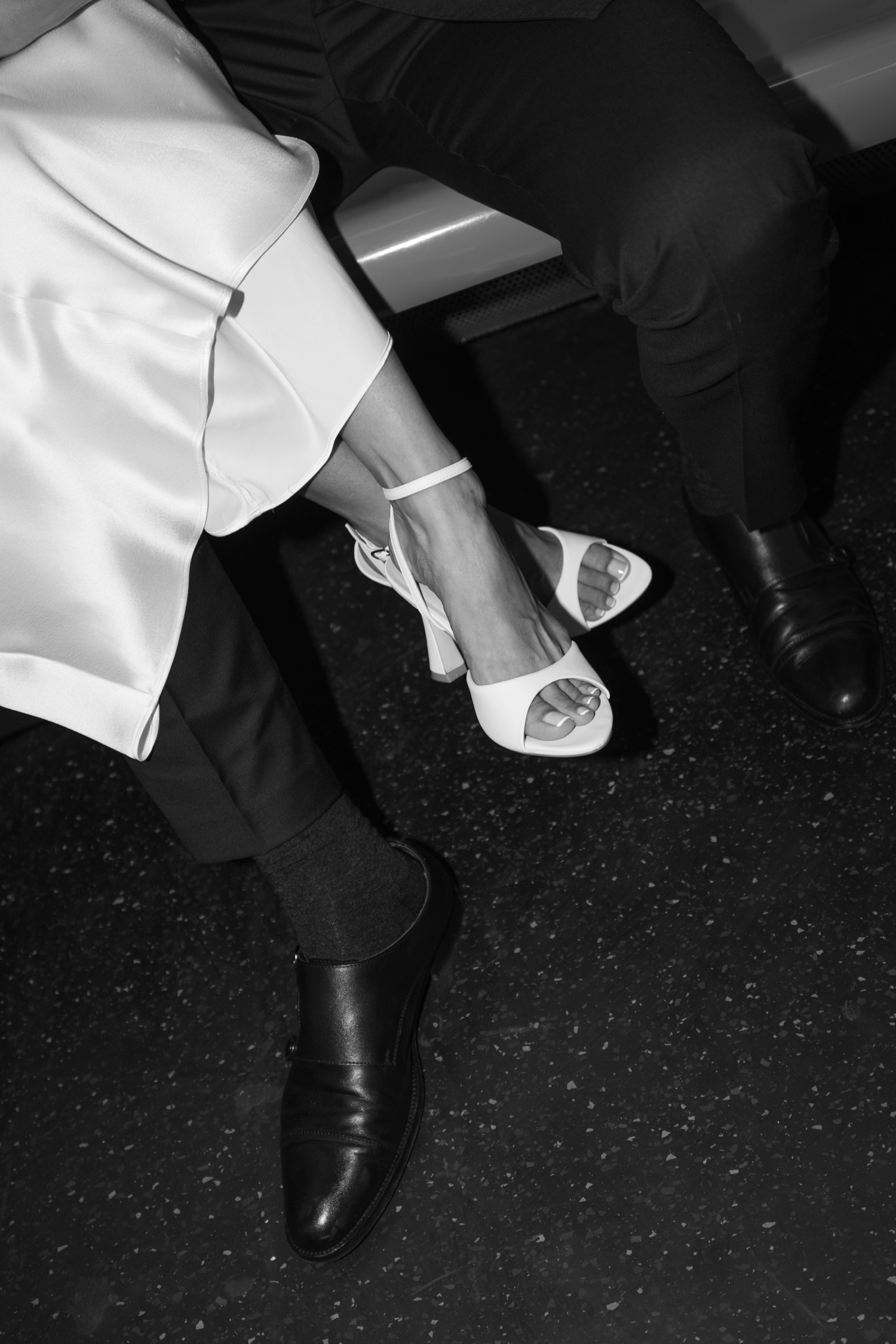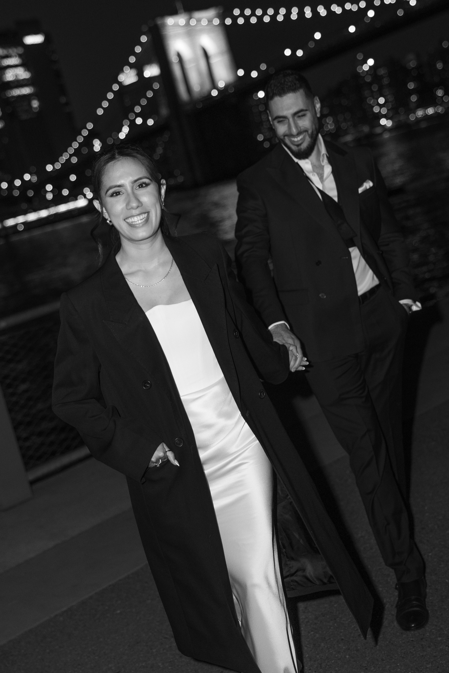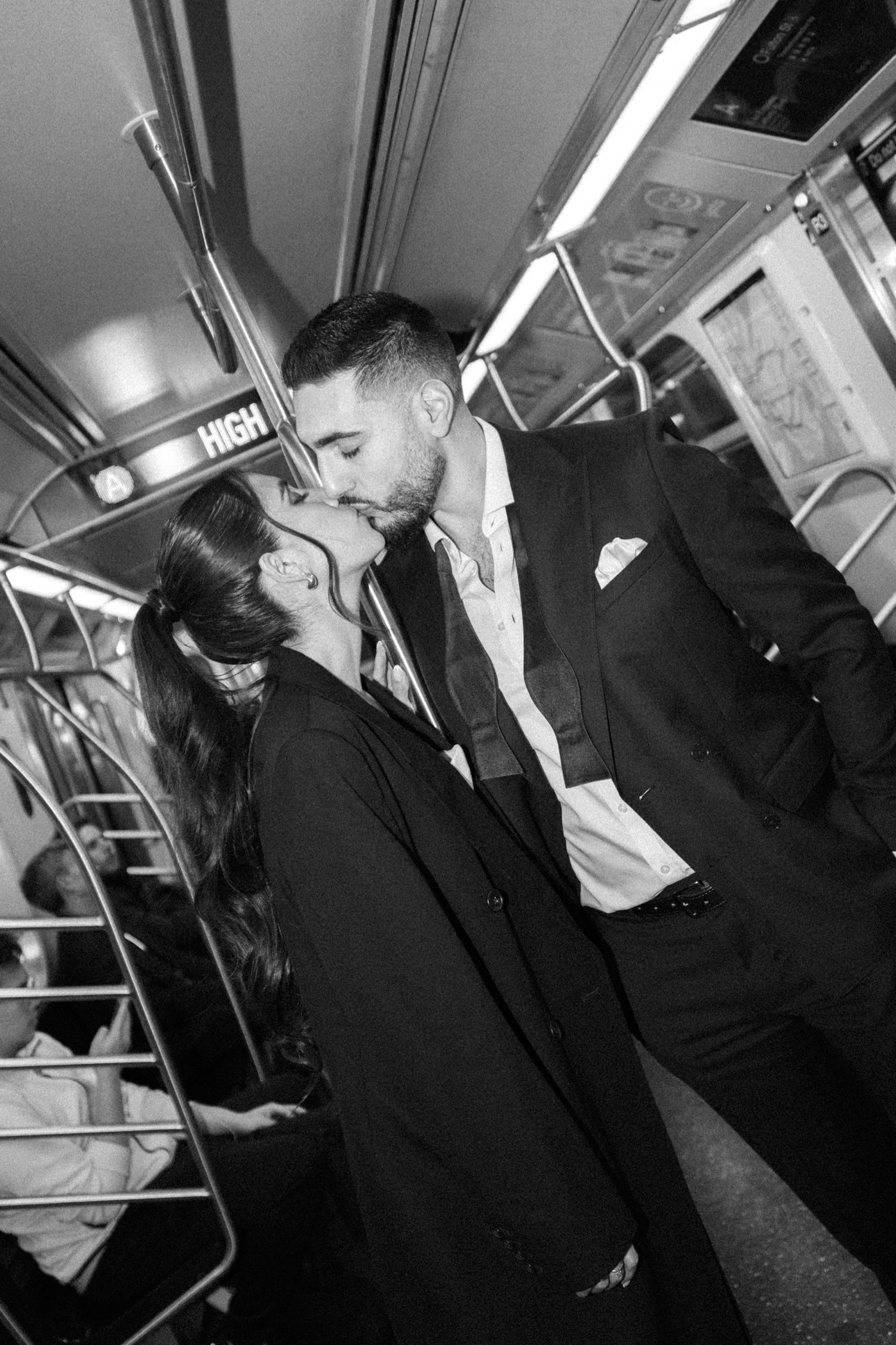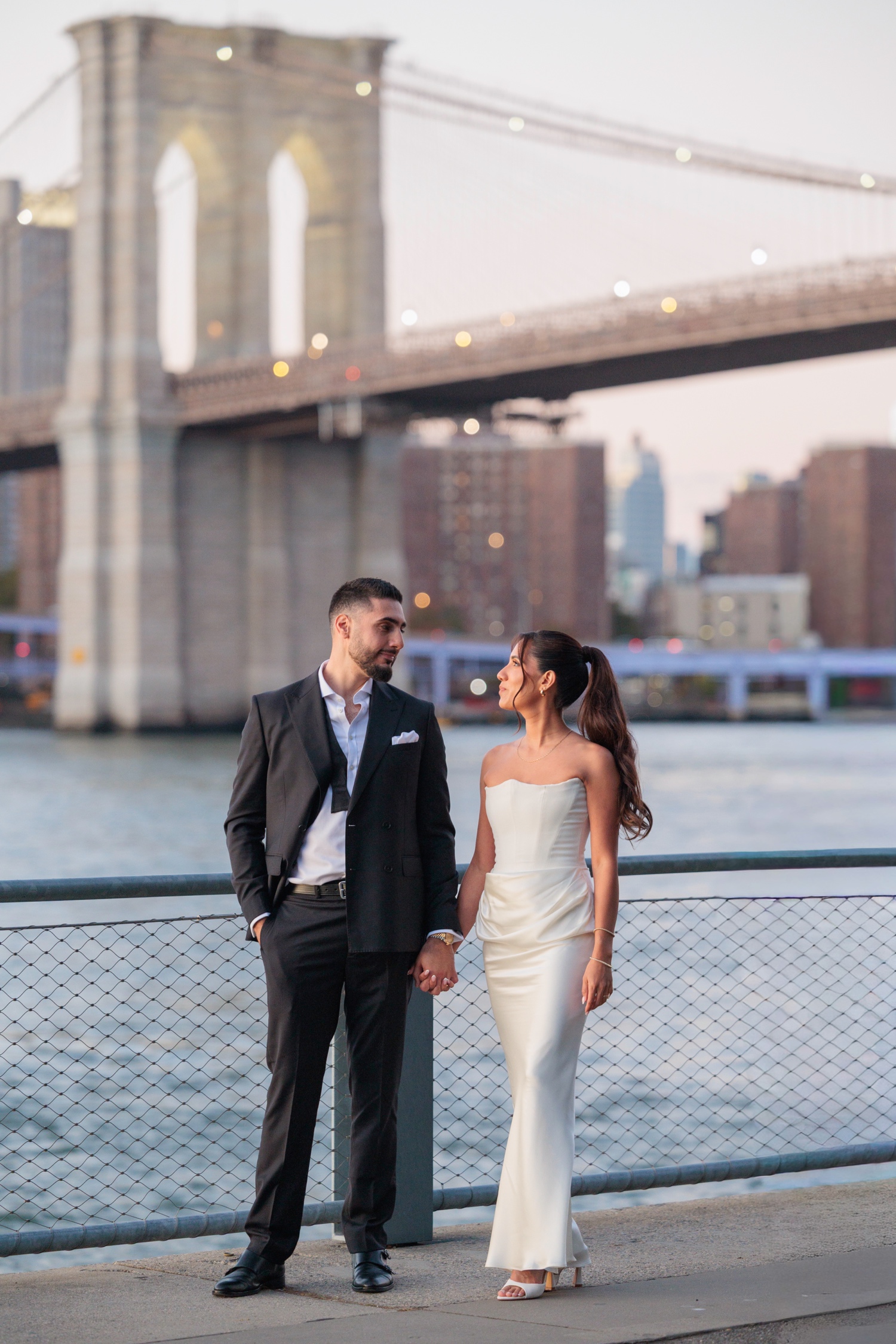 Next, we headed to Brooklyn Bridge Park, a spot that Aaliyah and John spent a lot of time together during their relationship. To add a little bit of extra fun to their wedding photos, we took the subwab, where we took a couple of wedding photos on the NYC subway. These candid moments showcased their personality in a different setting, adding a candid twist to their editorial and documentary wedding photos. This energy continued at Brooklyn Bridge Park where we captured natural and unposed moments – the essence of documentary wedding photography. The lighting of the city skyline provided a beautiful backdrop to their wedding photos.